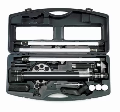 In dem stabilen Hartschalenkoffer, in dem Sie das Einsteigerteleskop perfekt aufbewahren und sicher mit auf Reisen nehmen können, finden Sie jede Menge Zubehör. Der 5x24-Sucher ist ein kleines Miniatur-Teleskop, das Sie einfach parallel auf das eigentliche Teleskop montieren. Mit seiner schwachen 5-fach-Vergrößerung und dem integrierten Fadenkreuz behalten Sie damit den Überblick am Sternhimmel. So ermöglicht er Ihnen das einfache Auffinden der Himmelsobjekte und die genaue Ausrichtung des Teleskops – bevor Sie dann den Anblick mit der höheren Vergrößerung genießen.