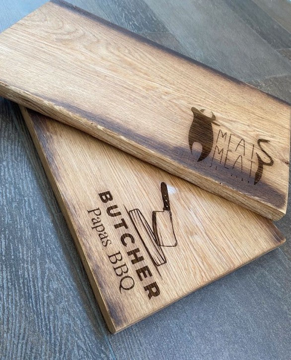 Zwei Holzschneidebretter mit Gravur aus Eiche.