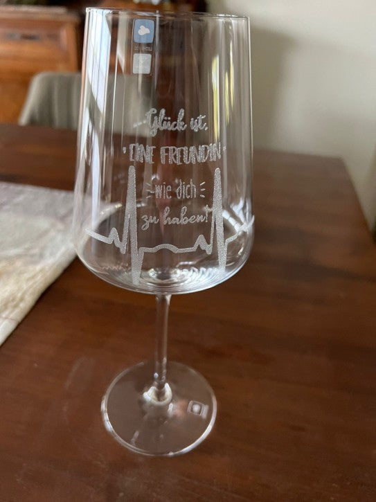 Ein Weißweinglas mit den Spruch: Glück ist eine Freundin wie dich zu haben.